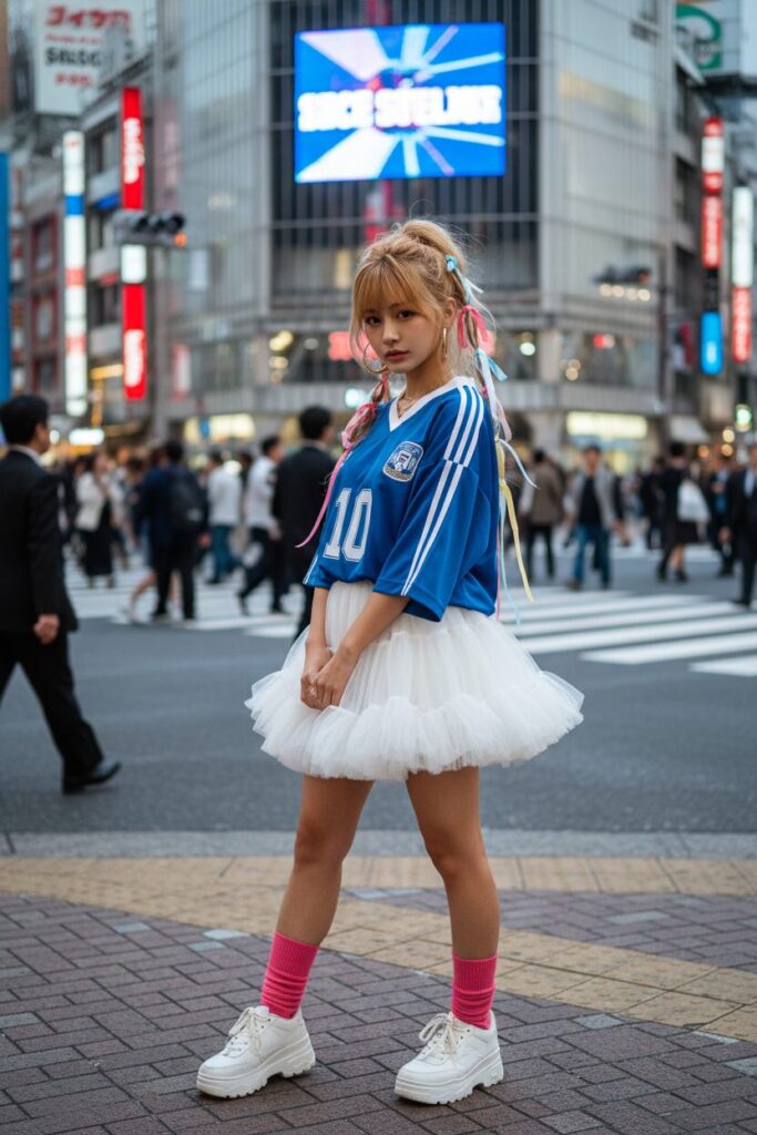 東京の雑踏を背景に、オーバーサイズの青いサッカーユニフォームに、白いレースのティアードミニスカート、そして赤いバレエシューズと白いルーズソックスを合わせたブロケットコアスタイルの若い日本人女性。自信に満ちた表情でポーズをとっているストリートスナップ風の一枚。
