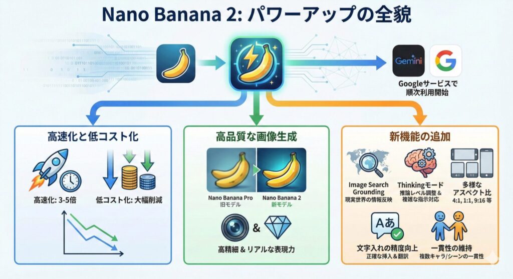 今回は、このパワーアップした「Nano Banana 2」の驚きの進化ポイントを、分かりやすく解説していきたいと思います。