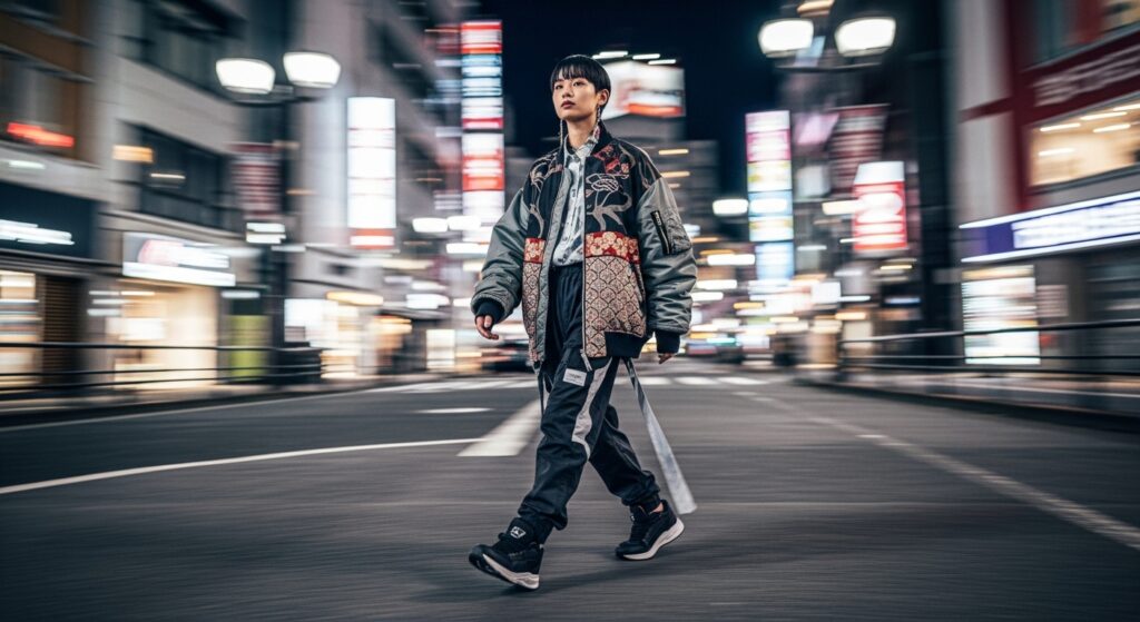 A dynamic full-body shot of a Japanese model walking confidently in a futuristic urban setting. They are wearing a layered outfit that subtly blends traditional Japanese patterns like seigaiha and asanoha into modern streetwear elements like an oversized bomber jacket and tech pants. Neon lights and motion blur create an energetic atmosphere. The background is a bustling Tokyo street at night, 16:9 aspect ratio, cinematic quality, hyper-realistic, fashion editorial style.