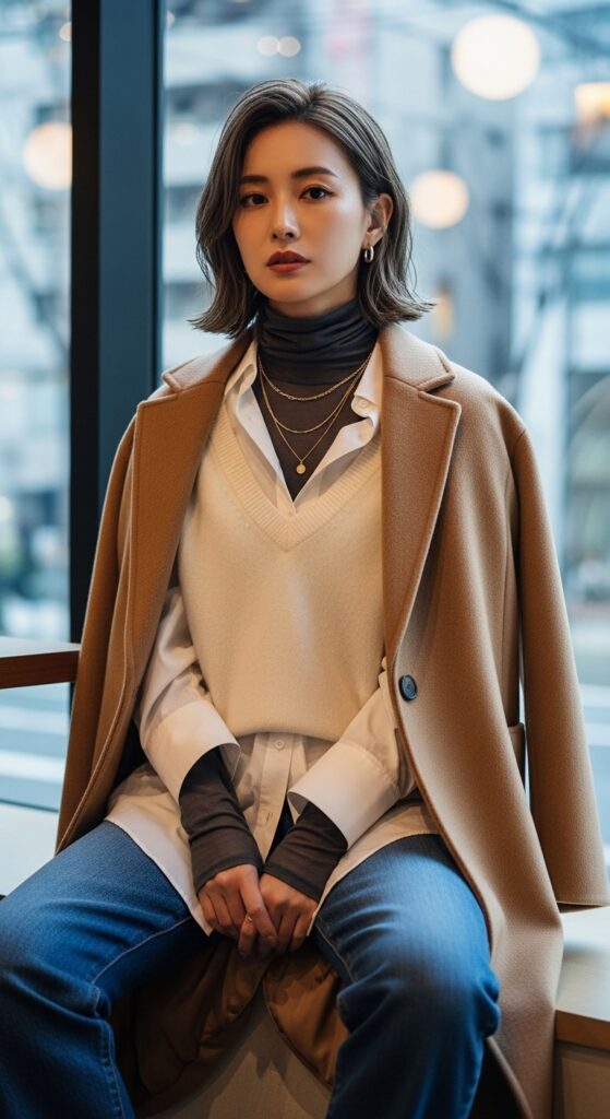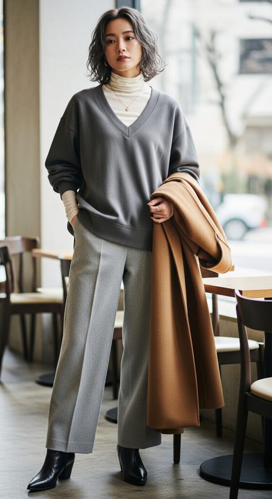 A full-body 9:16 aspect ratio fashion magazine photoshoot of a stylish Japanese woman in her late 20s with natural wavy ash-brown bob hair. She exudes an air of effortless chic, posing inside a modern, minimalist cafe in Tokyo. She is wearing a sophisticated layered outfit perfect for the transition from cold outdoors to warm indoors. The centerpiece is a delicate, semi-sheer off-white turtleneck made of ultra-fine fabric, visible under an oversized, V-neck sweatshirt in charcoal grey. The look is completed with elegant, light grey wide-leg wool trousers and sharp, black leather pointed-toe ankle boots. She casually holds a classic long wool coat in a warm camel color over her arm. The scene is bathed in soft, natural window light that highlights the textures of the fabrics. The background is a softly blurred cafe interior with a large window showing a glimpse of a winter city street. Photorealistic, cinematic quality, high detail, sophisticated and calm atmosphere.