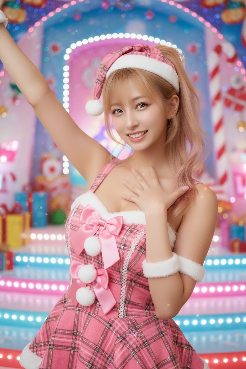 A girly, full-body photo of a Japanese woman in an idol-style pose on a pop Christmas stage set. She is wearing a pink plaid Santa costume with frills and ribbons, exuding a sweet and energetic vibe.